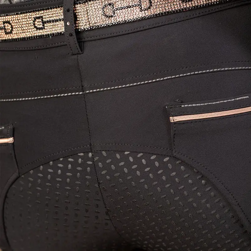 Kinder rijbroek gemaakt uit een elastische stof afgewerkt met modieuze rosegoude details. De rijbroek is voorzien van Full Grip siliconen zitvlak, contrast stiksels, crystal steentjes en elastisch gedeelte bij de enkels.