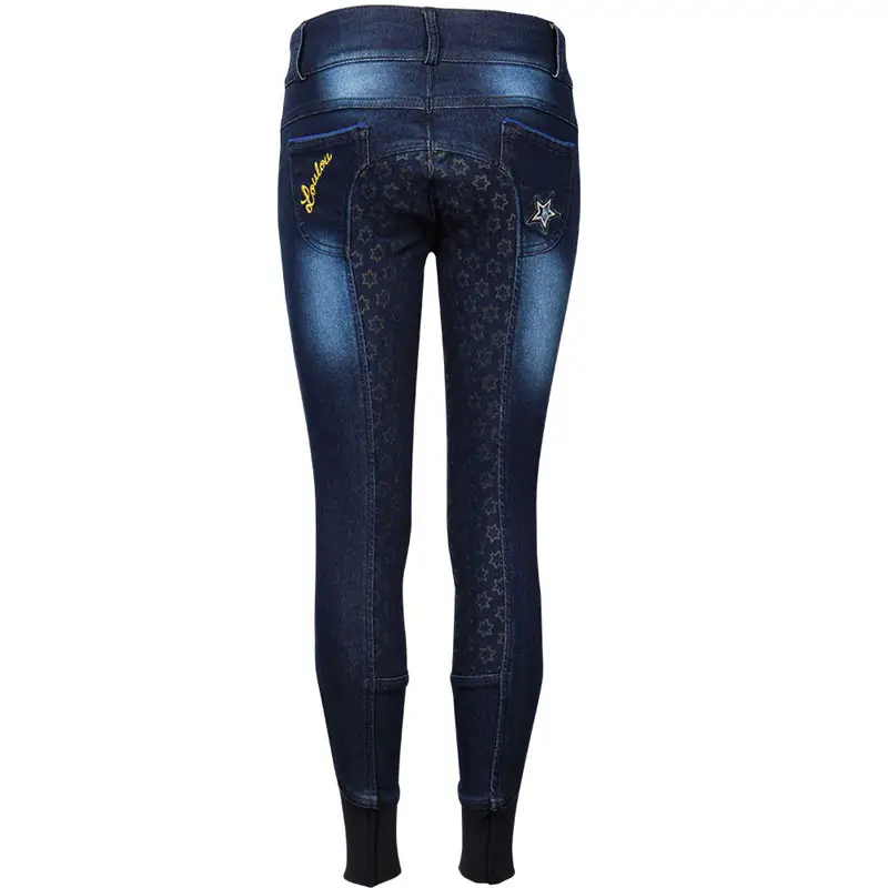Kinder rijbroek in denim look uit de Harry’s Horse LouLou collectie. De rijbroek is vervaardigd uit comfortabele elastische stof in combinatie met Full Grip siliconen zitvlak uitgevoerd in sterren print. De rijbroek is voorzien van zakken aan de voorzijde en elastisch gedeelte bij de enkels.