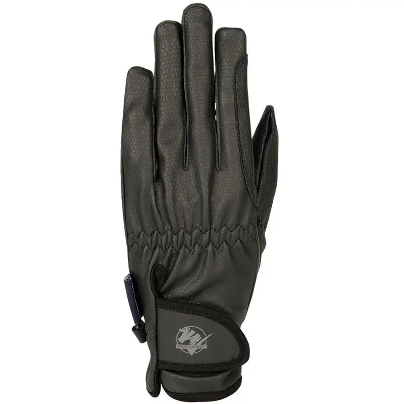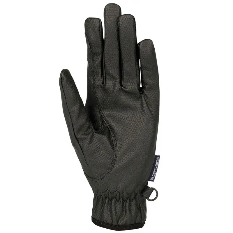 Comfortabele kunstlederen rijhandschoenen van het merk Harry’s Horse voorzien van teugel versteviging en klittenbandsluiting op de pols.