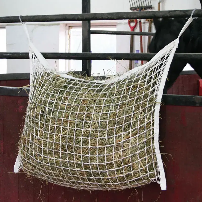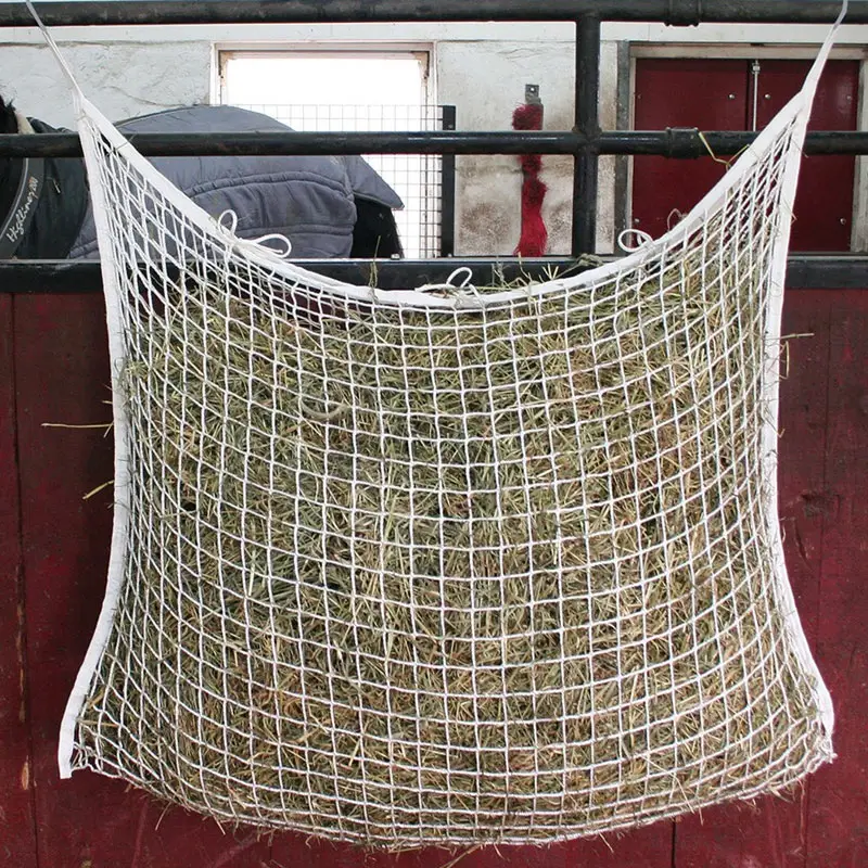 Dit sterke hooinet is een “slow feeder”. Door het fijne maassysteem (3 cm x 3 cm) wordt de snelheid van de ruwvoeropname vertraagd en de fourage-tijd verlengd. Doordat het hooinet fijnmazig is bespaar dit tot 30% voer. Met 2 lussen voor bevestiging.