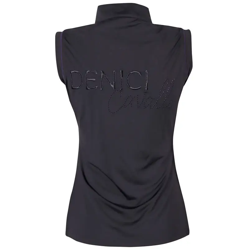 De Harry’s Horse Tanktop DC Amethyst zwart voor dames is afgewerkt met groot Denici Cavalli logo gemaakt uit een combinatie met kristal steenjtes op de achterzijde. Het shirt is voorzien van opstaande kraag met ritssluiting en heeft een paars piping langs de armsgaten.