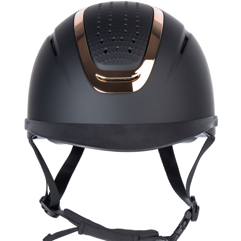 Harry’s Horse Veiligheidscap Mont Denali II Zwart/Rosegoud. Deze elegante cap is voorzien van meerdere ventiltiesleuven welke zorg draagt voor een goede luchtcircultie. De cap voldoet aan de CE EN1384:2023 veiligheidsnormering en is verstelbaar d.m.v. een draaiknop aan de achterzijde.