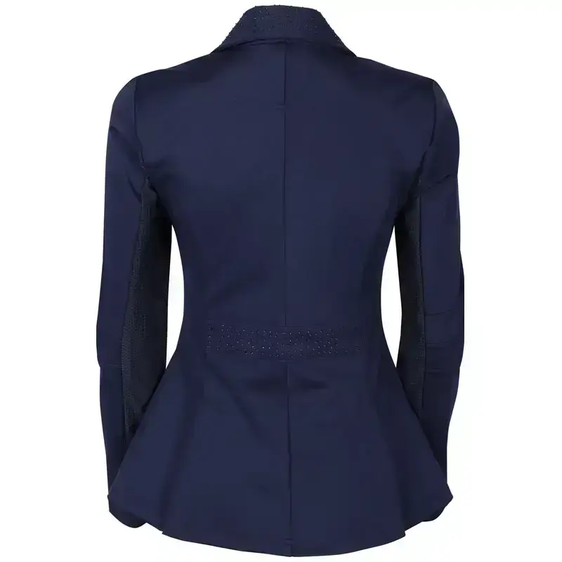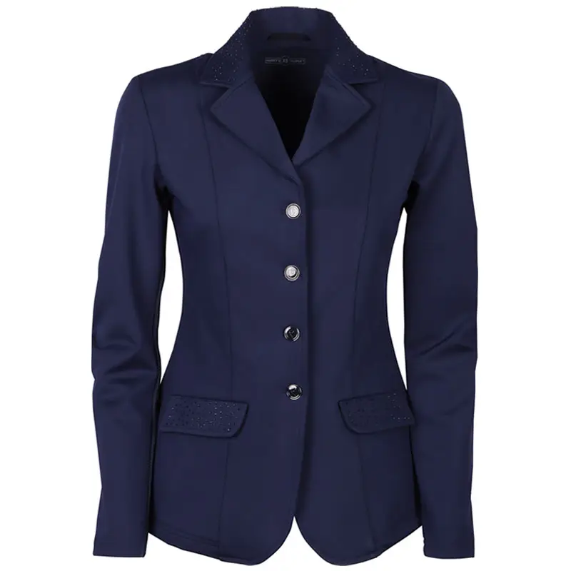 De Harry’s Horse wedstrijdjas Crystal Navy is gemaakt uit mooie kwaliteit stretch stof. Het jasje is uitgevoerd met steekzakken, knoopsluiting en achter de knoopsluiting een ritssluiting voor het creëren van een optimale pasvorm. De kraag, zakjes en de achterzijde in de taille zijn afgewerkt met subtiele crystal steentjes.