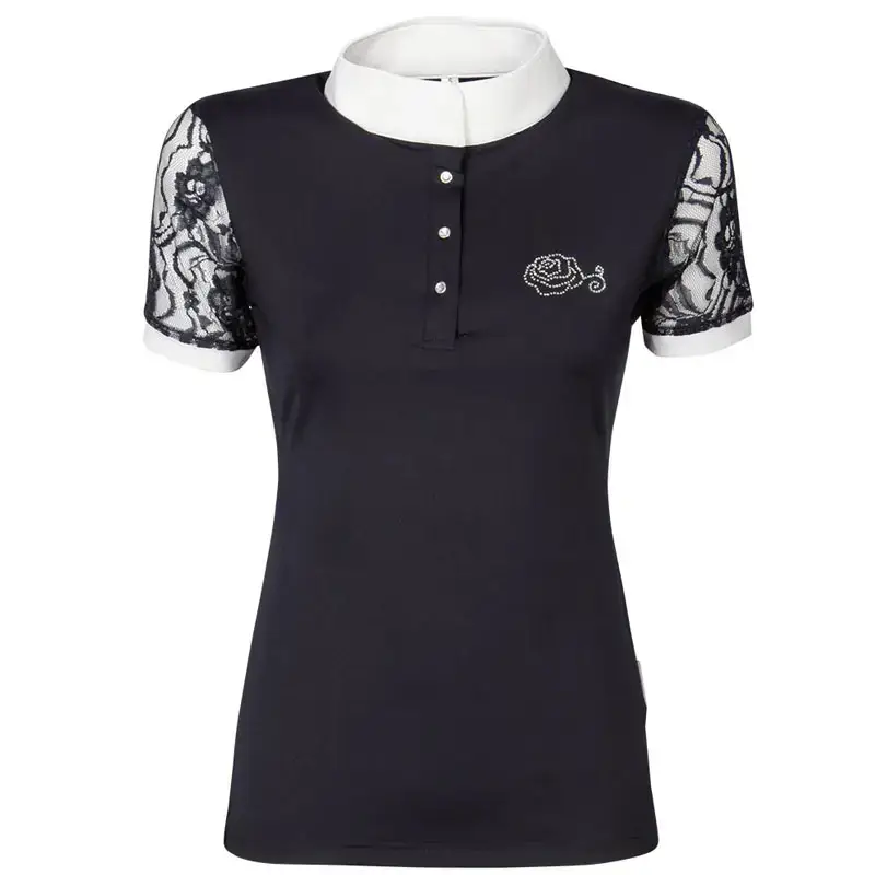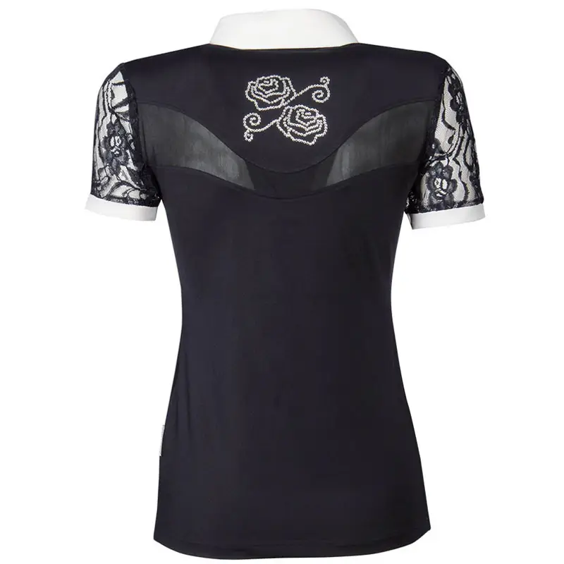 Modieus dames wedstrijdshirt met korte mouwen van kant. Het shirt heeft een opstaande kraag met drukknoopsluitingen voorzien van crystallen, een kanten inzet op de rug en is afgewerkt met een logo in de een vorm van een roos met crystallen op de voor- en achterzijde.