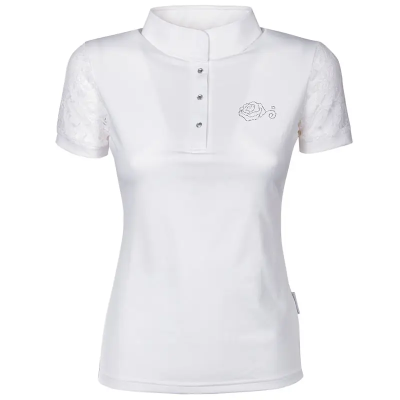Modieus dames wedstrijdshirt met korte mouwen van kant. Het shirt heeft een opstaande kraag met drukknoopsluitingen voorzien van crystallen, een kanten inzet op de rug en is afgewerkt met een logo in de een vorm van een roos met crystallen op de voor- en achterzijde.