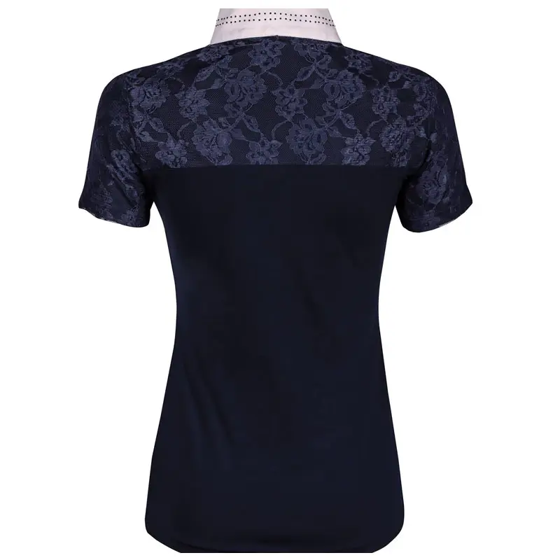 Het Harry’s Horse wedstrijdshirt Venice navy is een luxe shirt met opstaande kraag in combinatie met korte ritssluiting en een afwerking met crystal steentjes rondom. Over de schouders en een gedeelte op de rug is het shirt voorzien van kante details.
