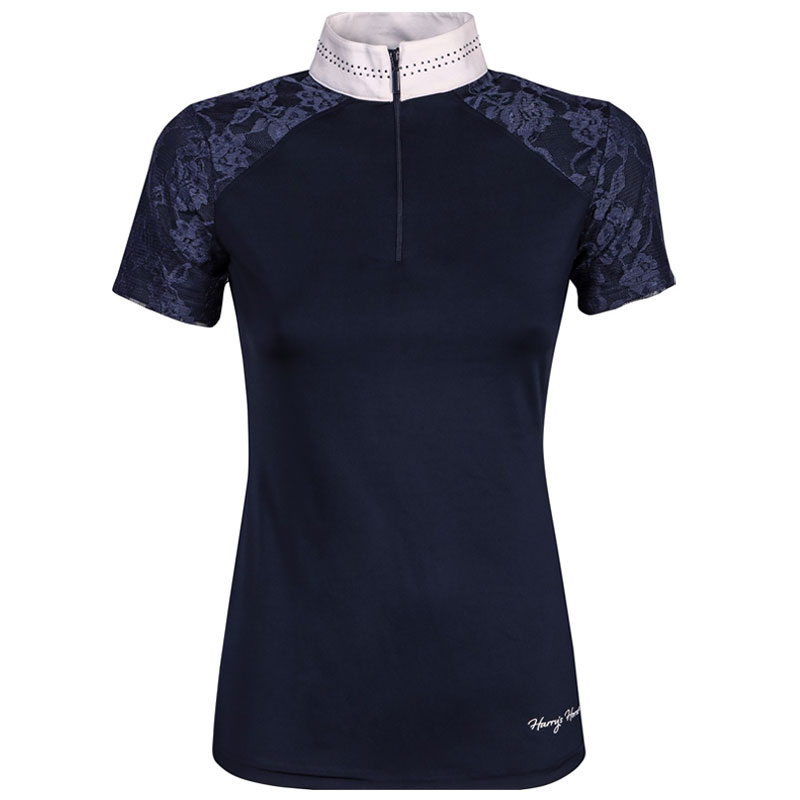Het Harry’s Horse wedstrijdshirt Venice navy is een luxe shirt met opstaande kraag in combinatie met korte ritssluiting en een afwerking met crystal steentjes rondom. Over de schouders en een gedeelte op de rug is het shirt voorzien van kante details.