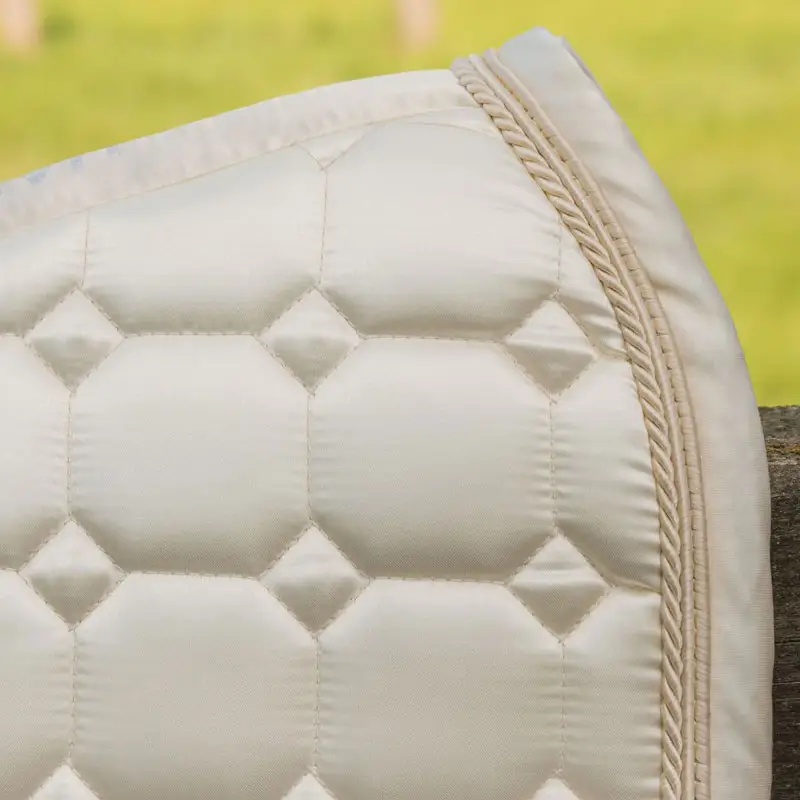 Harry’s Horse Zadeldek EQS Ivory Cream. Luxe dekje vervaardigd een een stevige kwaliteit satijn wat zorg draagt voor een luxieuze uitstraling. Het dekje is afgewerkt met een elegant sierkoord in combinatie met koordpiping en is voorzien van een ademende mesh voering.