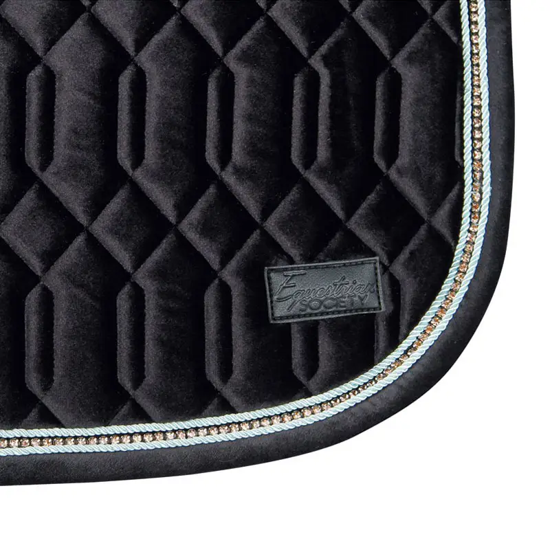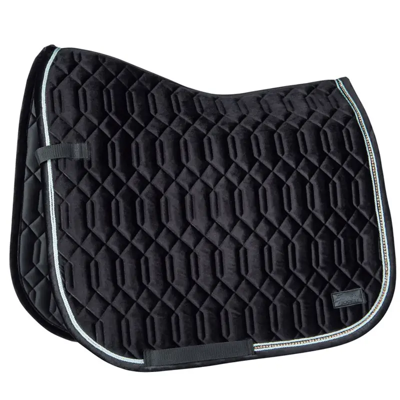 Zoals de naam zegt is het Harry’s Horse zadeldek Velvet Zwart bekleed met fluweel en afgewerkt met een dubbele koordpiping met crystal steentjes hier tussen in. Het dekje heeft een luxe badge op de linker zijde en is voorzien van een Quick Dry mesh voering welke het vocht absorbeerd.
