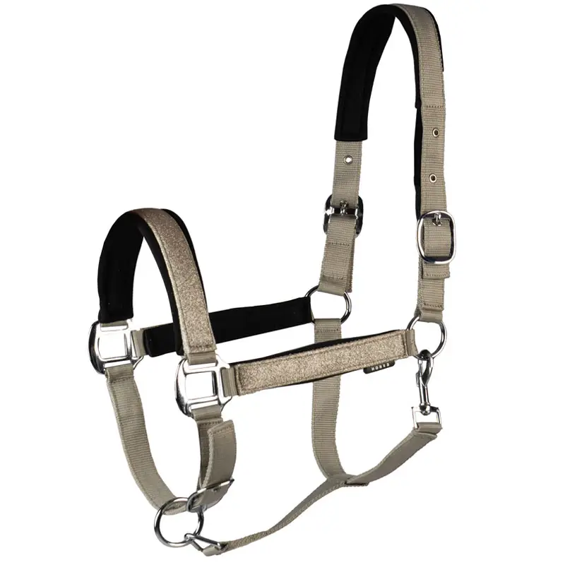 Horka Halsterset Brilliance Dune afgewerkt met glitter details op zowel de neusriem als kopstuk en de bakstukken. Het halster is met zachte neopreen gevoerd en heeft een dubbel verstelbaar kopstuk en een verstelbare neusriem. wordt geleverd inclusief bijpassend halstertouw.