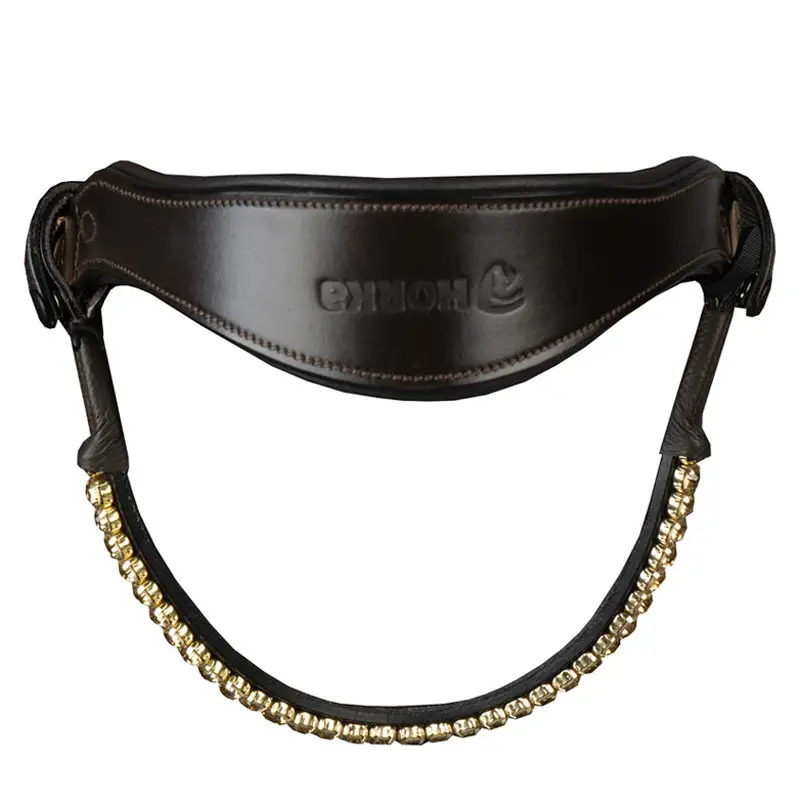 Horka Hoofdstel Filius Bruin/Goud voorzien van een brede anatomisch gevormde aansnoerneusriem uitgevoerd in lak in combinatie met een zacht gevoerd anatomisch gevormd kopstuk. De frontriem is afgewerkt met kristal steentjes en heeft drukkers aan het uiteinde voor het gemakkelijk verwisselen van de frontriem. Het hoofdstel wordt geleverd compleet met bijpassende teugels voorzien van verborgen handstops en blinde haakjessluitingen.