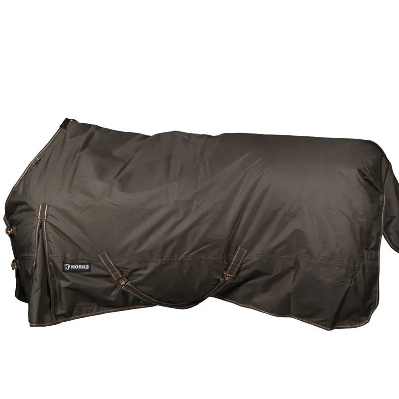 Horka Outdoordeken Dime 600D – 200 Grams coffee/rosegoud. Waterdichte winterdeken vervaardigd uit 600 Denier ripstop polyester en voorzien van dubbele verstelbare voorsluitingen met musketon, loopsplitten, dubbele verstelbare kruissingels, elastisch verstelbare lieskoorden en staartflap. De deken is uitgevoerd met rosegoud gekleurde fournituren en details.
