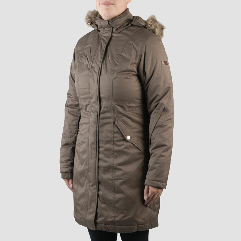 De Horka outdoorjas Typhoon Coffee/Rosegoud is een modieuze winterjas van waterdicht materiaal met getapete naden en windflappen aan de binnen- en buitenkant van de rits, wat deze jas perfect maakt voor verschillende weersomstandigheden. De jas heeft een afneembare capuchon met een imitatie bontrand. De jas is voorzien van een fleece gevoerde opstaande kraag voor extra warmte. De jas beschikt over vele handige details; voorzakken, binnenzakken, verborgen borstzakken en een split aan de achterkant, wat deze jas ook geschikt maakt voor het paardrijden.