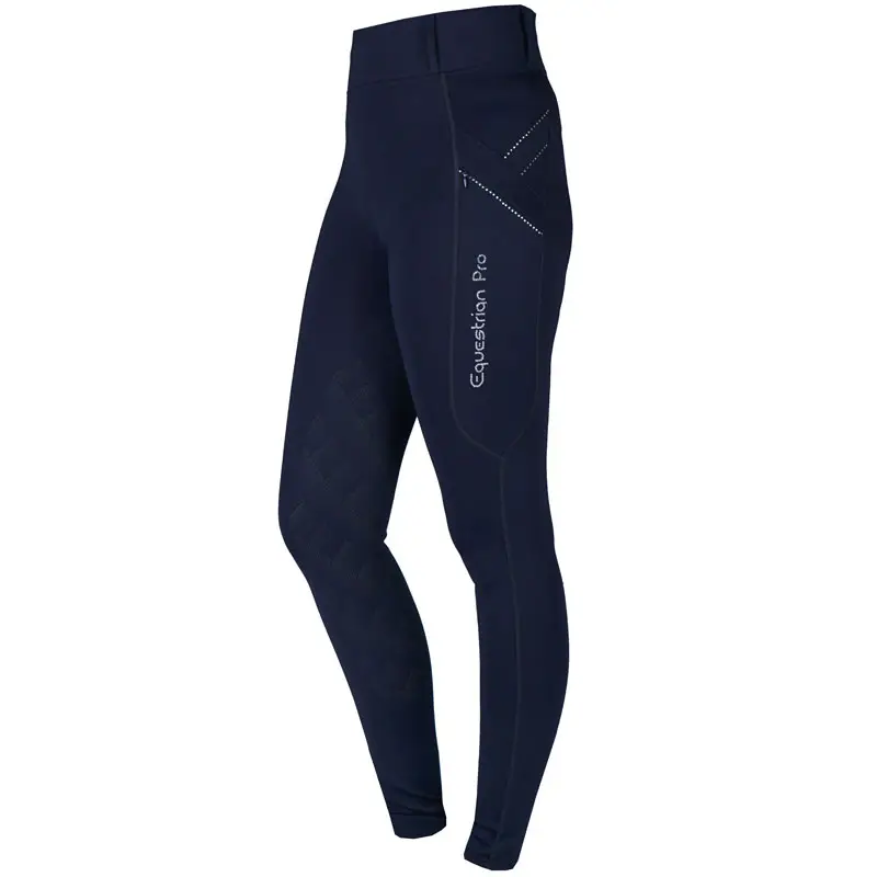 Horka Rijlegging Momentum Full Grip blauw voor dames. Een opvolger van de welbekende Horka rijlegging Jubilee. De Horka rijlegging Momentum is een sportieve rijlegging met een Grip zitvlak en voorzien van zakken aan de zijkant met ritssluiting. De tailleband van deze rijlegging is uitgevoerd met riemlussen, zodat ook een ceintuur niet mistaat. De rijlegging is afgewerkt met kristallen details en Equestrian Pro logo uit kristallen op het linker been.