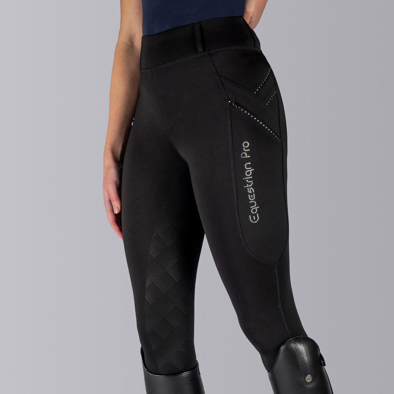 Horka Rijlegging Momentum Full Grip zwart voor dames. Een opvolger van de welbekende Horka rijlegging Jubilee. De Horka rijlegging Momentum is een sportieve rijlegging met een Grip zitvlak en voorzien van zakken aan de zijkant met ritssluiting. De tailleband van deze rijlegging is uitgevoerd met riemlussen, zodat ook een ceintuur niet mistaat. De rijlegging is afgewerkt met kristallen details en Equestrian Pro logo uit kristallen op het linker been.