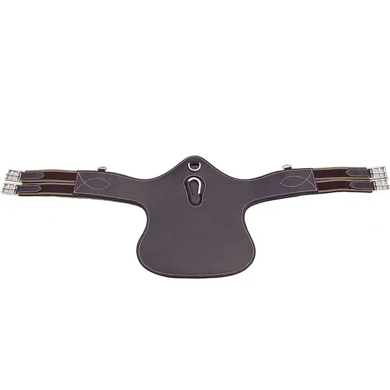 De Horka springsingel leer bruin is een zachte gevoerde singel voorzien van buikflap, 3 D-ringen, karabijnhaak en aan beide kanten elastiek met gespen aan de uiteinde.