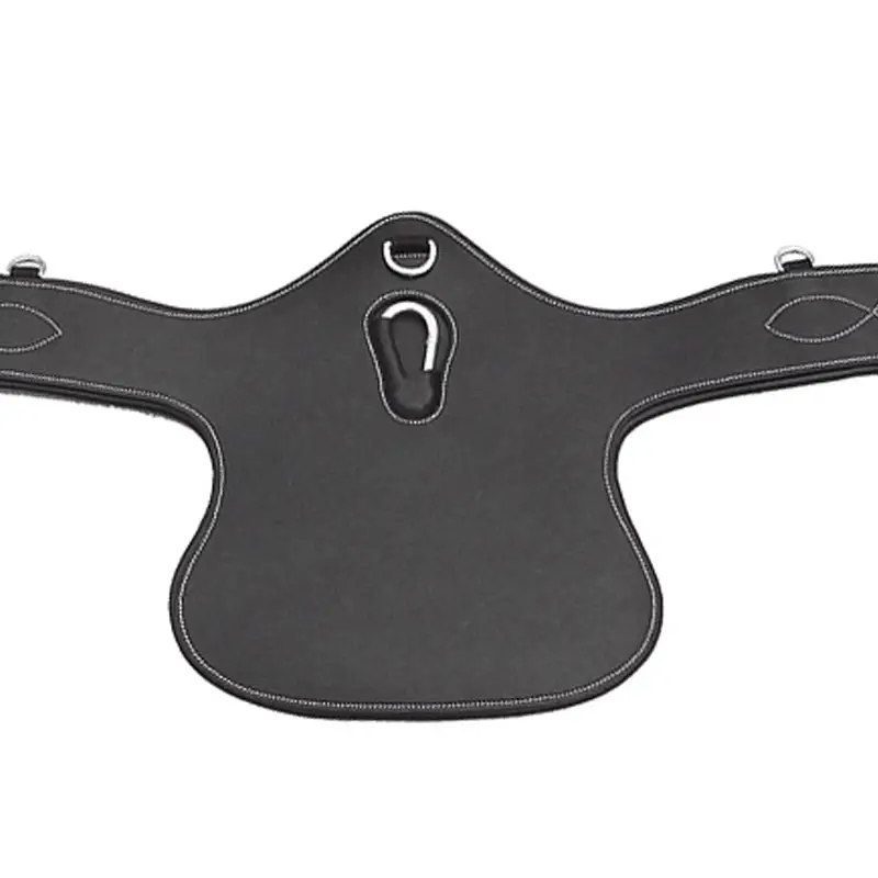 De Horka springsingel leer zwart is een zachte gevoerde singel voorzien van buikflap, 3 D-ringen, karabijnhaak en aan beide kanten elastiek met gespen aan de uiteinde.