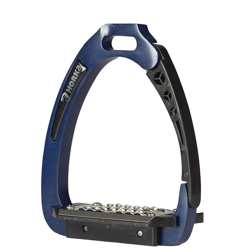 Horka veiligheidsbeugel 5 Star Blauw uitgerust met veiligheidsmeganisme. Deze stijgbeugels worden gebruikt met het scharnierpunt aan de buitenzijde waardoor deze tijdens een val gemakkeljk open gaan.