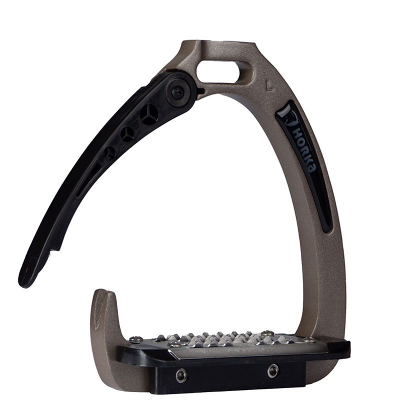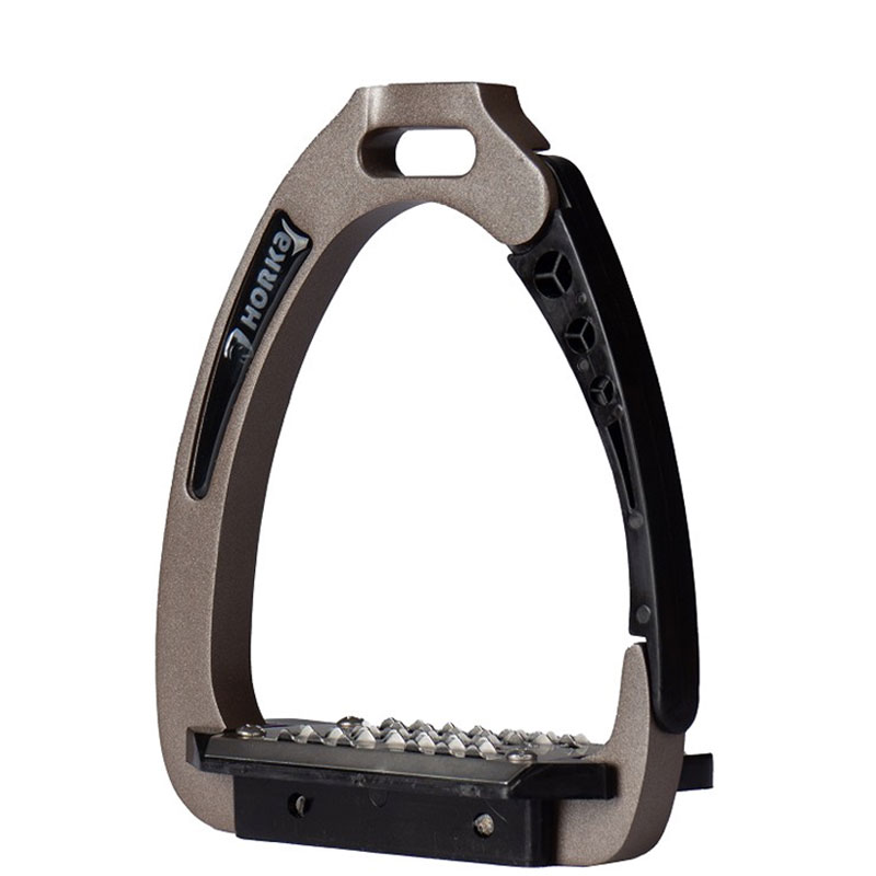 Horka veiligheidsbeugel 5 Star Bruin uitgerust met veiligheidsmeganisme. Deze stijgbeugels worden gebruikt met het scharnierpunt aan de buitenzijde waardoor deze tijdens een val gemakkeljk open gaan.