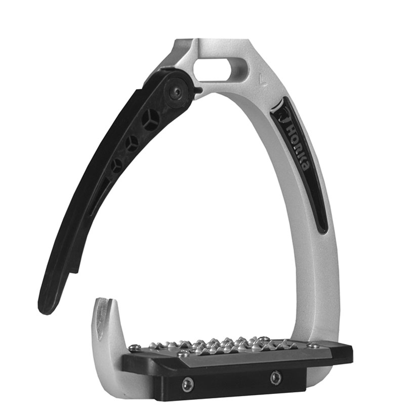 Horka veiligheidsbeugel 5 Star Zilver uitgerust met veiligheidsmeganisme. Deze stijgbeugels worden gebruikt met het scharnierpunt aan de buitenzijde waardoor deze tijdens een val gemakkeljk open gaan.