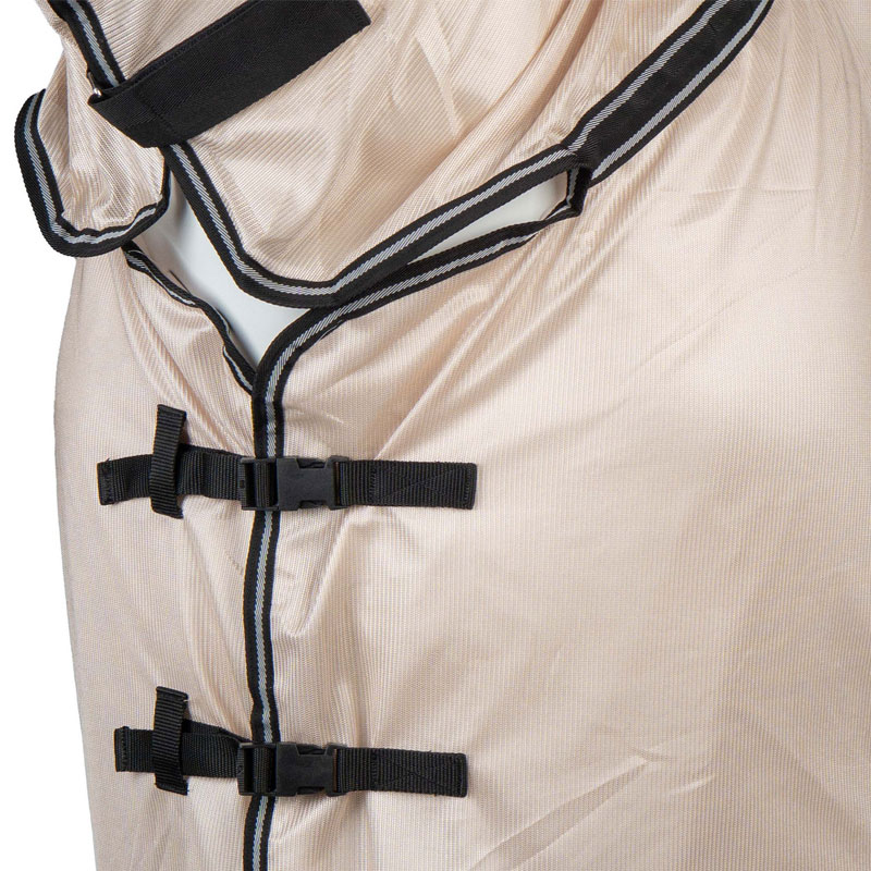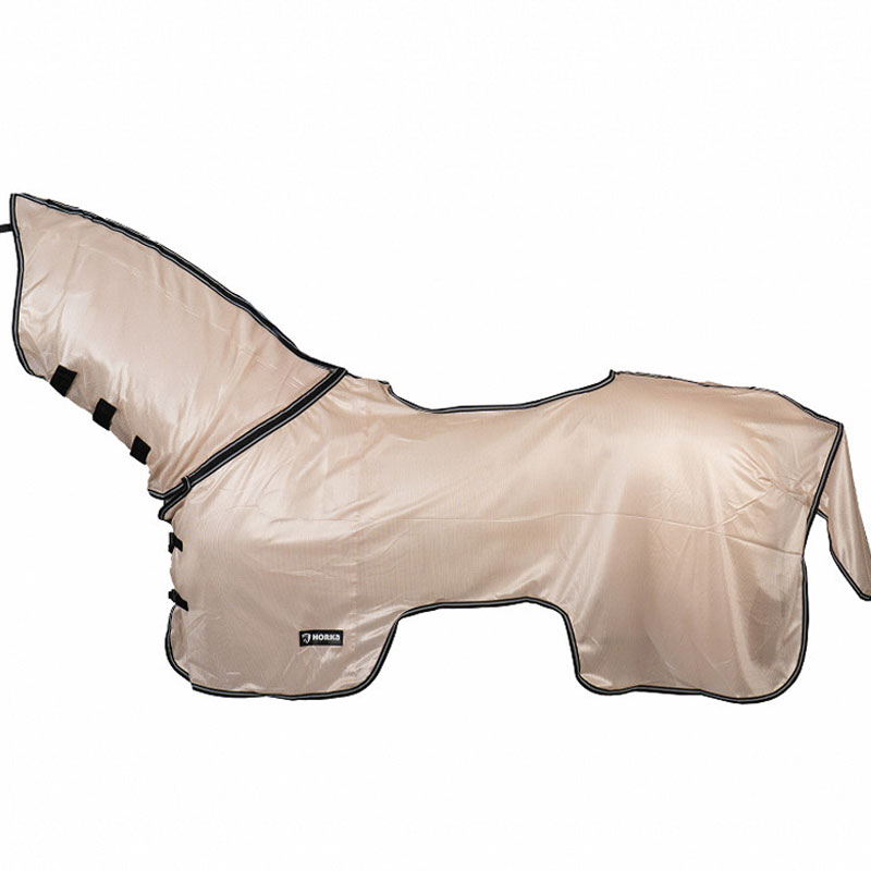 Horka vliegen uitrijdeken Rosegoud met vast hals gedeelte met drie klittenbandsluitingen en uitsparing voor het zadel. De deken is op de borst, nek en staartflap met nylon gevoerd ter voorkoming van schuren. Voorzien van plastic fournituren en staartkoord. * anti vliegen -uitrijdeken * vast hals gedeelte * gedeeltelijke nylon voering ter voorkoming van schuren * platic fournituren * staartkoord * bekijk de maattabel voor het kiezen van de juiste maat