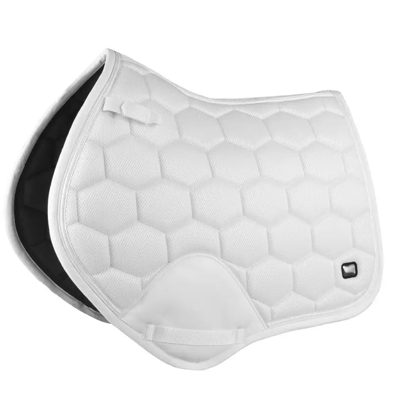 Horka Zadeldek Brilliance Wit. Sportief ergonomisch gevormd zadeldekje uit de Horka collectie gemaakt uit mesh materiaal met een anatomisch gevormde rugnaad. Door het mesh materiaal is het dekje bijzonder goed ademend wat ideaal is voor gebruik in de zomer. Het dekje is afgewerkt met een glitter bies rondom en Horka badge aan de linker zijde.