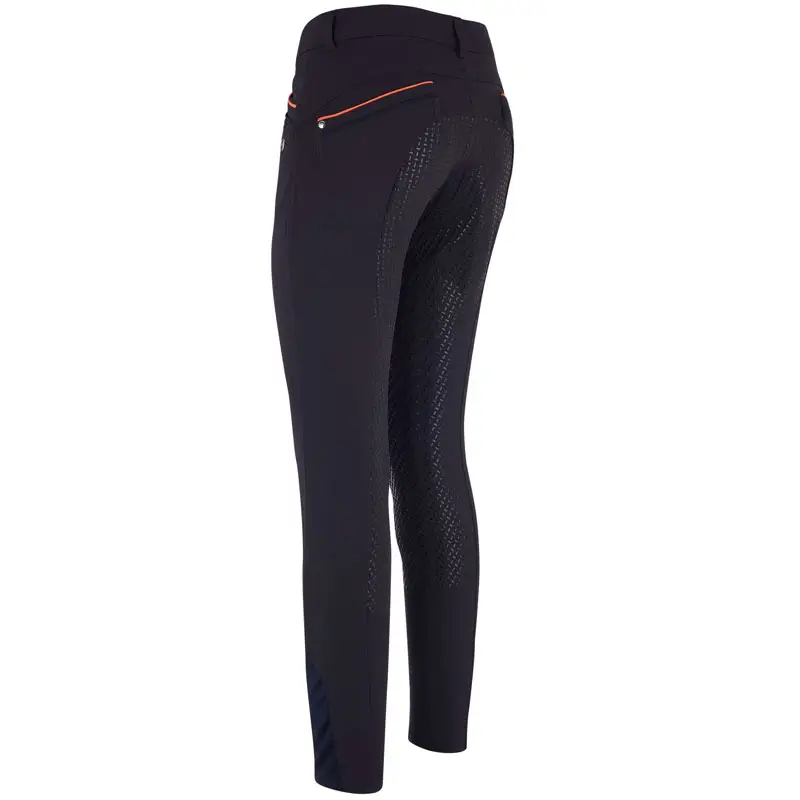 Dames rijbroek vervaardigd uit zeer comfortabele en elastische polyamide stof. De rijbroek is afgewerkt felgekleurde contrasterende details en is voorzien van full grip siliconen zitvlak en elastisch gedeelte bij de enkels.
