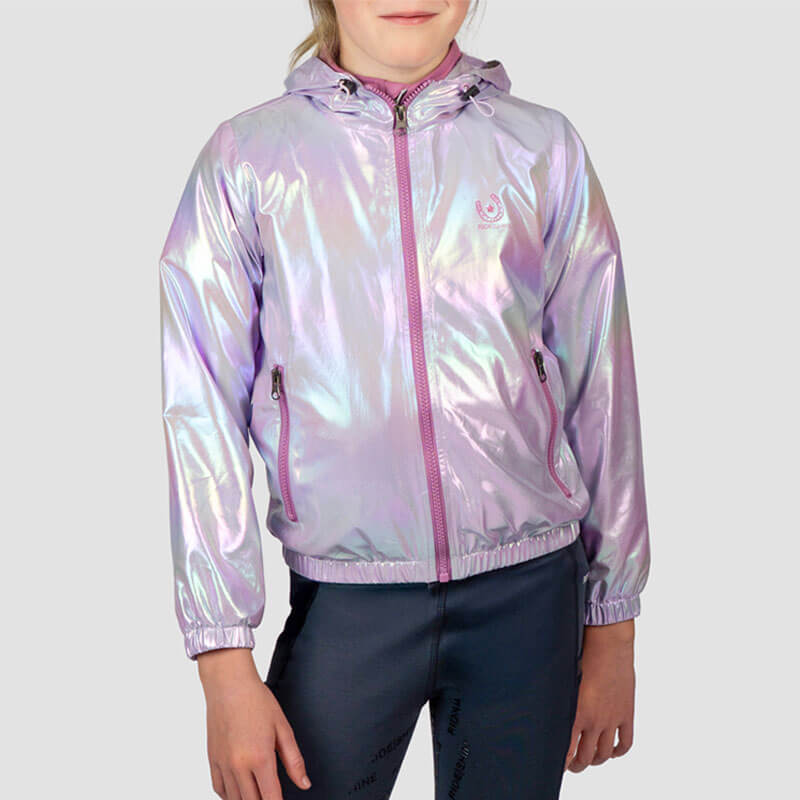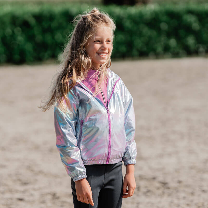 Jas Red Horse Yuma Kids. Paardrijjas voor kinderen geschikt voor de zomer in een opvallend Hologram effect. Het jasje heeft een mesh voering en is voorzien van capuhon en zakken met ritssluiting. Afgewerkt met glitter logo en shiny details.