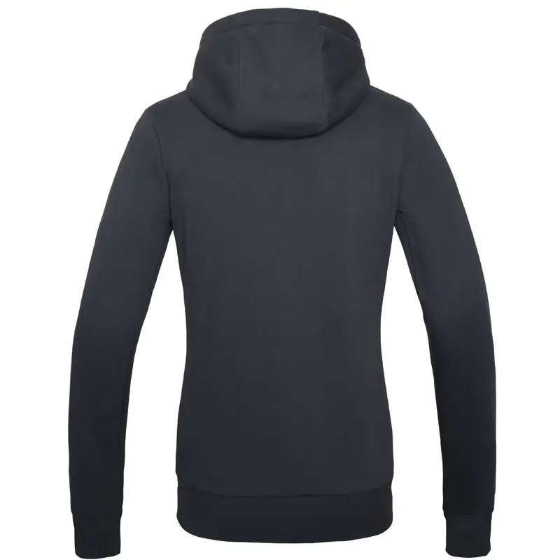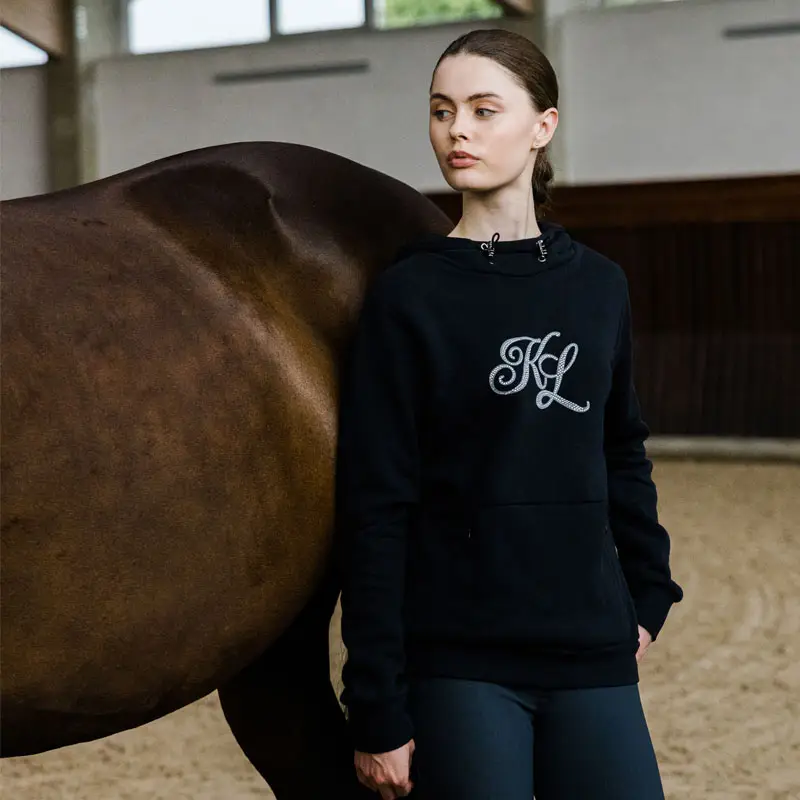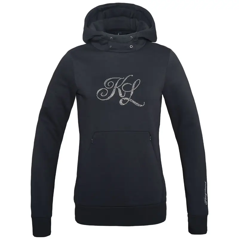 Modieuze Kingsland hoodie Elyse navy voorzien van afsluiting bij de capuchon met drukkers en groot KL logo uit strass steentjes op de borst. De hoodie is aan de binnenzijde met geborsteld fleece gevoerd. De uiteinde van de mouwen en aan de onderzijde is deze hoodie uitgevoerd met elastisch rib materiaal wat zorg draagt voor een goed aansluitende pasvorm.
