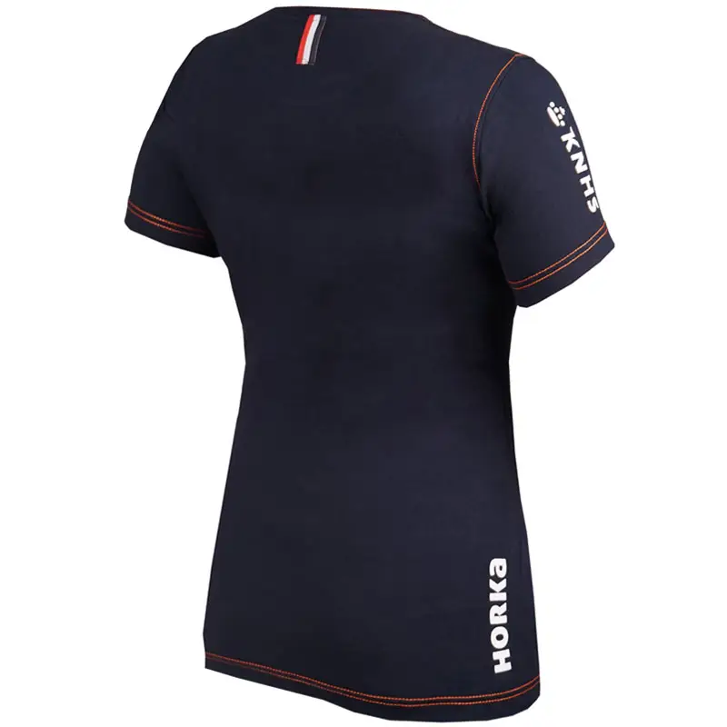 Katoenen shirt voor kinderen uit de KNHS collectie gemaakt bij Horka. Het shirt heeft een ronde hals, korte mouwen en is afgewerkt met Horka logo op de linker mouw, KNHS logo op de rechter mouw en Horka print op de achterzijde.