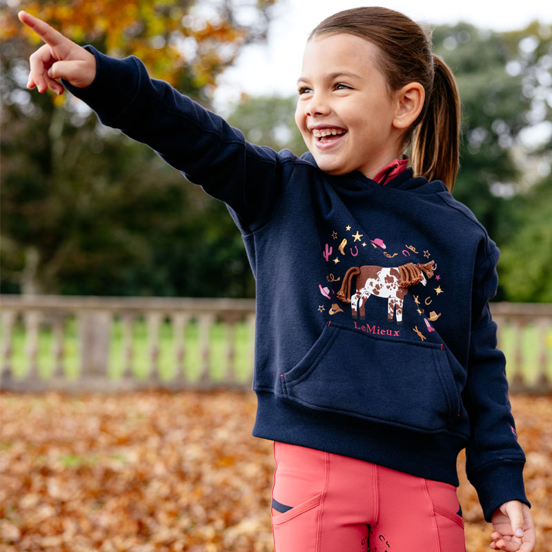 LeMieux Hoodie Romi Kids Navy. Super gave kinder hoodie uit de LeMieux wintercollectie vooorzien van elastische rib boord aan de uiteinde van de mouwen en aan de onderzijde. De hoodie is voorzien van capuchon, kangoeroezakken en heeft een schitterende afwerking met een geborduurde applicatie en speelvolle details.