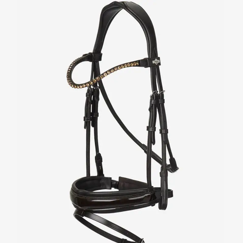 Online onlyHet LeMieux Hoofdstel Kudos Patent Dressage Bruin is vervaardigd uit zacht Europees kwaliteit leer. Het hoofdstel is voorzien van een anatomisch gevormd kopstuk met zacht gevoerde uitsparing rond de oren en nek om te helpen bij de verdeling van de druk, voor optimaal comfort. De frontriem is afgewerkt met kristal steentjes. Dit in combinatie met de bruine lak neusriem draagt zorg voor een unique uitstraling.