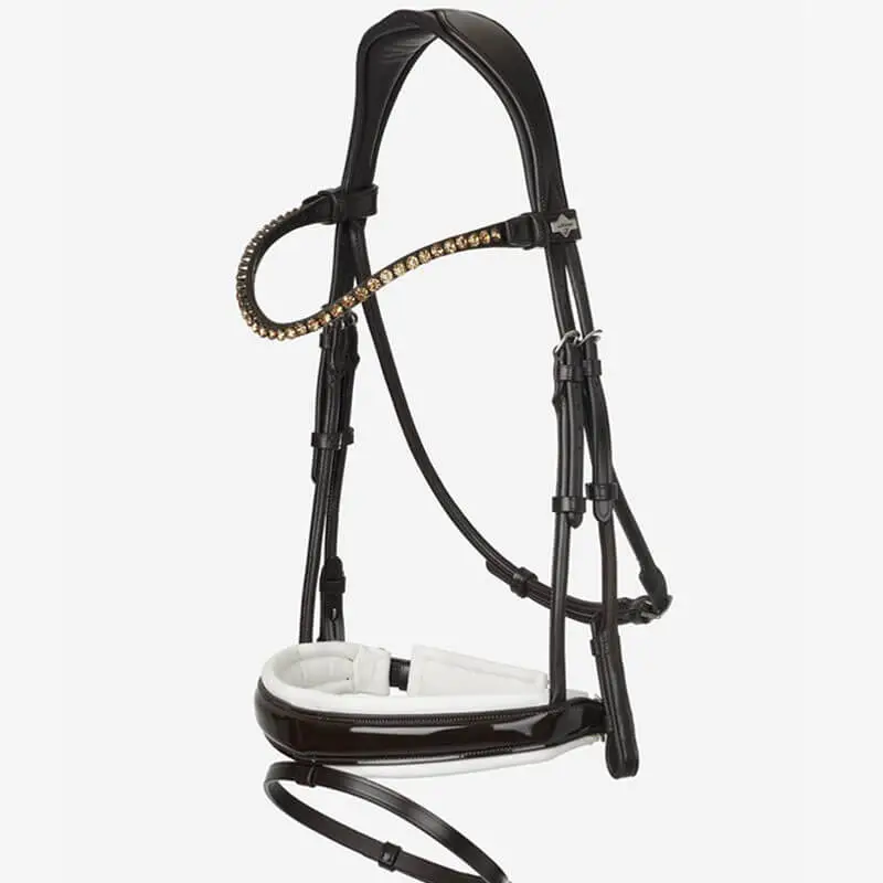 Online onlyHet LeMieux Hoofdstel Kudos Patent Dressage Bruin/Wit is vervaardigd uit zacht Europees kwaliteit leer. Het hoofdstel is voorzien van een anatomisch gevormd kopstuk met zacht gevoerde uitsparing rond de oren en nek om te helpen bij de verdeling van de druk, voor optimaal comfort. De frontriem is afgewerkt met kristal steentjes. Dit in combinatie met de bruine lak neusriem draagt zorg voor een unique uitstraling.