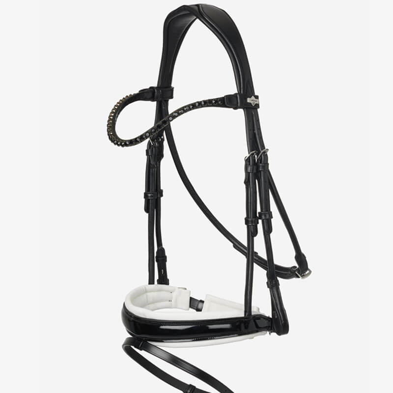 Het LeMieux Hoofdstel Kudos Patent Dressage Zwart/Wit is vervaardigd uit zacht Europees kwaliteit leer. Het hoofdstel is voorzien van een anatomisch gevormd kopstuk met zacht gevoerde uitsparing rond de oren en nek om te helpen bij de verdeling van de druk, voor optimaal comfort. De frontriem is afgewerkt met zwarte kristal steentjes. Dit in combinatie met de zwart lak neusriem draagt zorg voor een unique uitstraling.