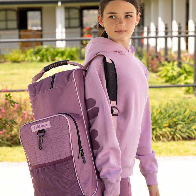 LeMieux Laarzen En Captas Mallow gemaakt uit sterk polyester met waterafstotende eigenschappen. De tas is voorzien van een scheidingswand voor de rijlaarzen, handgrepen, en een verstelbare schouderband voor het gemakkelijke transporteren. Aan de voorzijde van de laarzentas zit een extra vak met ritssluiting wat onder andere geschikt is voor het opbergen van de cap.