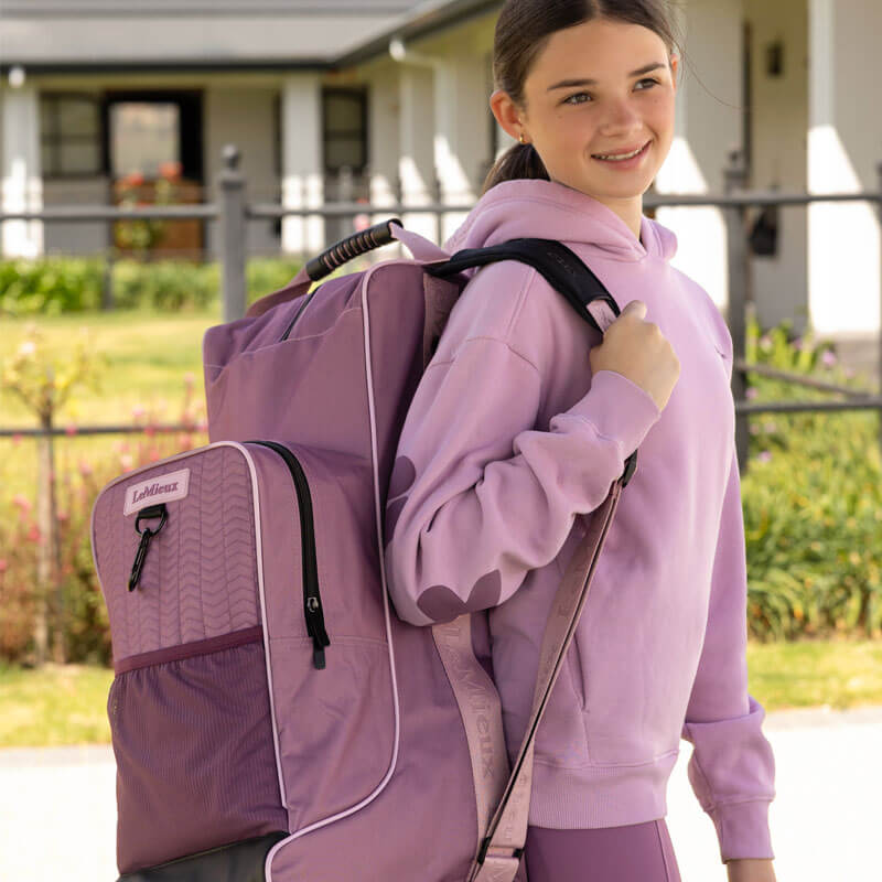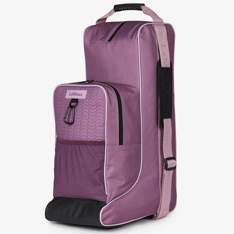 LeMieux Laarzen En Captas Mallow gemaakt uit sterk polyester met waterafstotende eigenschappen. De tas is voorzien van een scheidingswand voor de rijlaarzen, handgrepen, en een verstelbare schouderband voor het gemakkelijke transporteren. Aan de voorzijde van de laarzentas zit een extra vak met ritssluiting wat onder andere geschikt is voor het opbergen van de cap.
