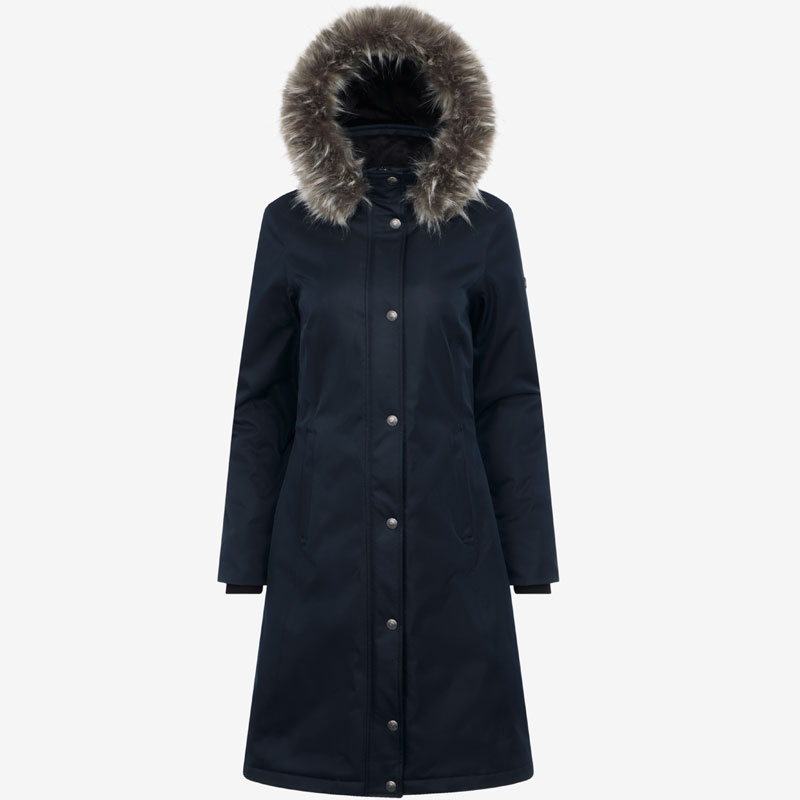 LeMieux Lange Jas Anya Waterdicht Navy. Functionele, comfortabele warme jas welke goed te gebruiken is op het zadel door de lange split met druksluitingen aan de achterzijde. De jas is voorzien van afneembare capuchon in combinatie met afneembare bontkraag en heeft een heerlijke warme synthetische DuPont voering. De jas is tevens met fleece gevoerd op het ruggedeelte voor het creëren van extra warmte en comfort.