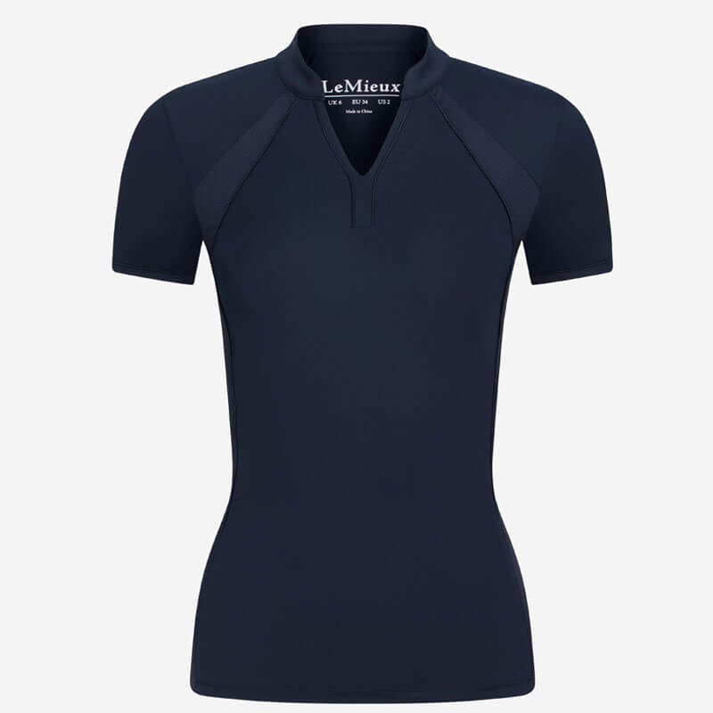 LeMieux Mesh Base Layer Lisa Navy. Dames paardrijshirt uitgevoerd met een ingesneden halslijn en mesh zijpanelen voor optimale ventilatie en een goed ademend vermogen. Het shirt heeft een stijlvolle nauwaansluitende pasvorm en is afgewerkt met satijnen biesdetails en een glanzend siliconen logo op de achterzijde tussen de schouderbladen.