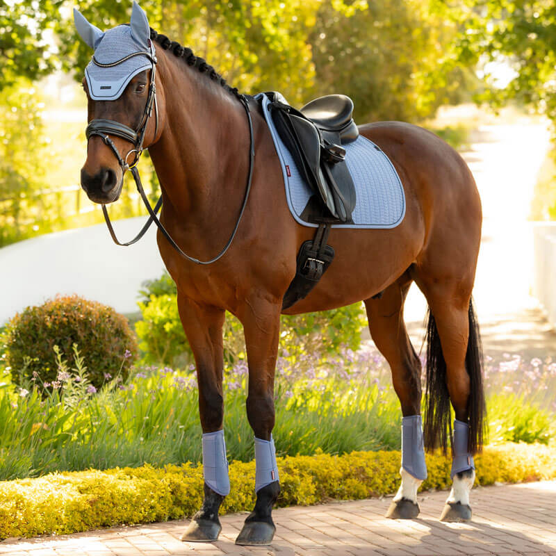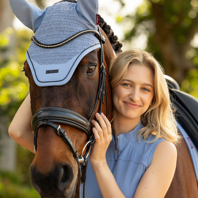LeMieux Oornetje Essence Powder Blue. Met de hand gehaakt oornetje in een sportief gehaakt design met elastische, zachte en comfortabele oren. Het oornetje heeft een lusje aan de onderzijde voor de bevestiging van een eventueel los koord. Afgewerkt met matchend LeMieux logo aangebracht op een softshell patch om het gewicht van het oornetje te verminderen.