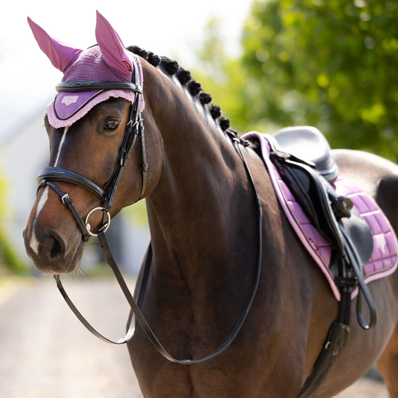 LeMieux Oornetje Loire Mallow. Met de hand gehaakt oornetje voorzien van elastische, zachte en comfortabele oren en contrasterende koordpiping en bies. Het oornetje heeft een satijnen afwerking met LeMieux rubber logo in het midden gecentreerd.