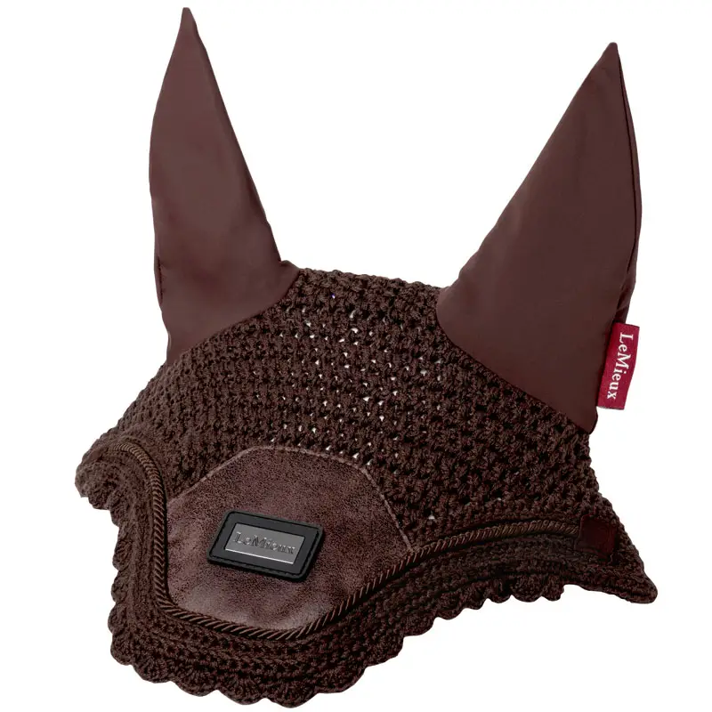 Chiq LeMieux oornetje Rhone Espresso gemaakt uit gehaakt katoen met elastische lycra oren. Het oornetje is afgewerkt met koordpiping en metalen LeMieux badge in het midden gecentreerd.