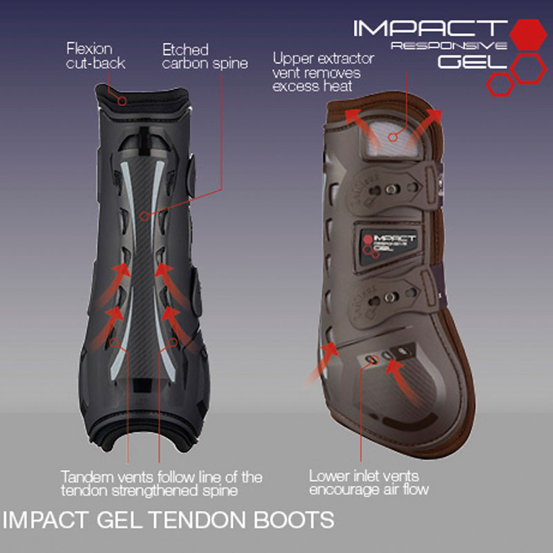 Anatomisch gevormde peesbeschermers vervaardigd uit een lichtgewicht schokbestendige schaal verstevigd met carbon voor een optimale ondersteuning en bescherming van de pezen. De peesbeschermers zijn voorzien van diverse vantilatie openingen en hebben een Impact Responsive Gel voering.