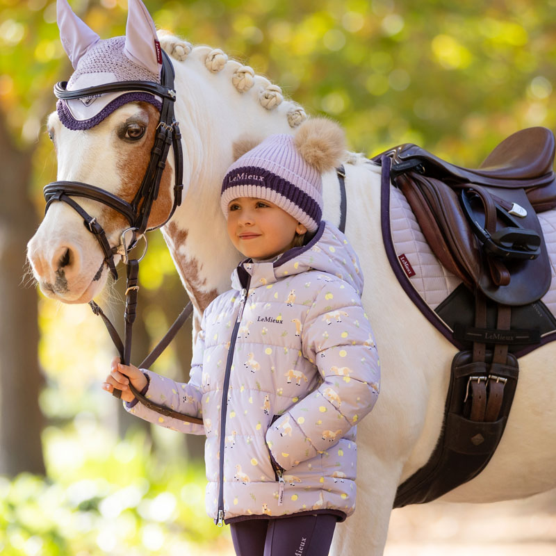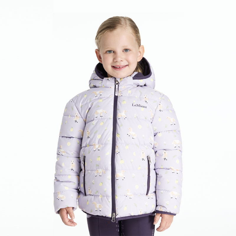 LeMieux Puffer Jas Lilo Kids Lilac. Gevoerde horizontaal doorgestikte winterjas voor kinderen met een allover “Lemon” pony print. De jas is voorzien van een microfleece gevoerde capuchon, tweeweg ritssluiting en fleece gevoerde zakken met ritssluiting.