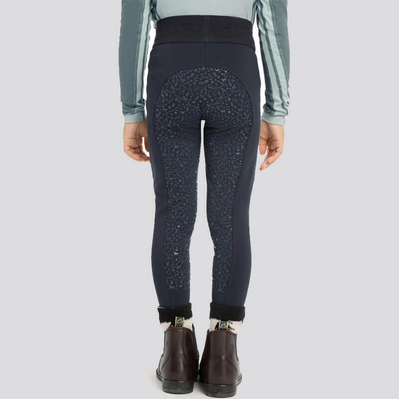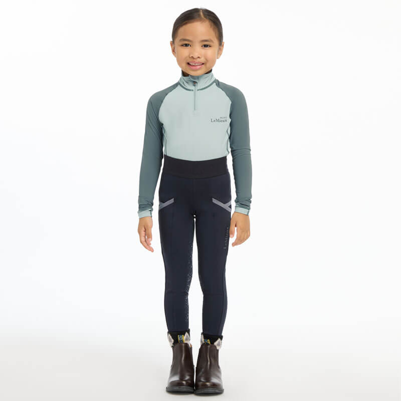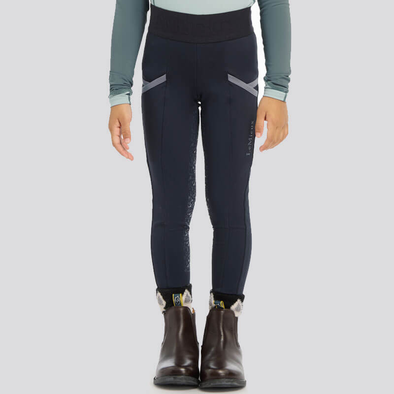 LeMieux Rijlegging Mini Kids Navy. Lichtgewicht kinder paardrijlegging gemaakt uit technische stof met comfortabele elastische tailleband en Grip zitvlak voor extra stabiliteit in het zadel. De legging heeft een zak op beide benen onder andere geschikt voor de mobiele telefoon.