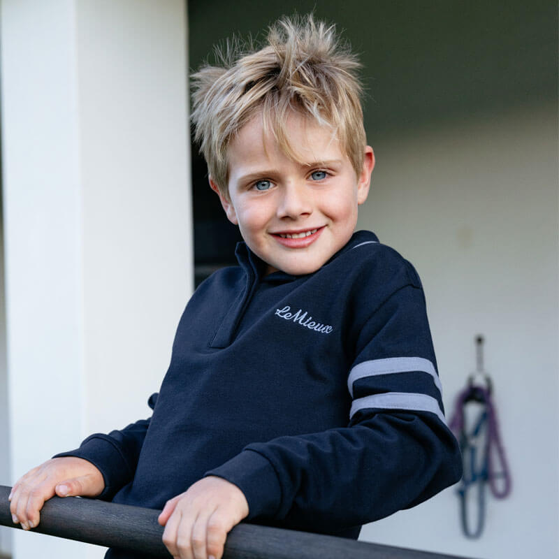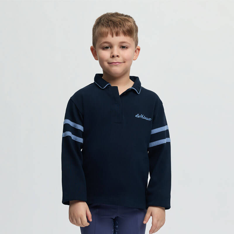 LeMieux Rugby Shirt Robbie Mini Kids Navy. Klassiek kinder paardrijshirt met de details van een rugby shirt. Voorzien van boordje met verborgen knoopsluiting, lange mouwen en geborduurd LeMieux logo op de borst en groot geborduurd logo op de rug.