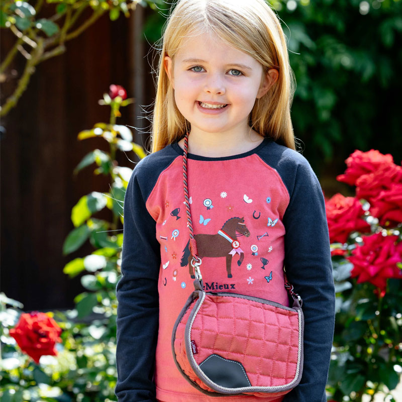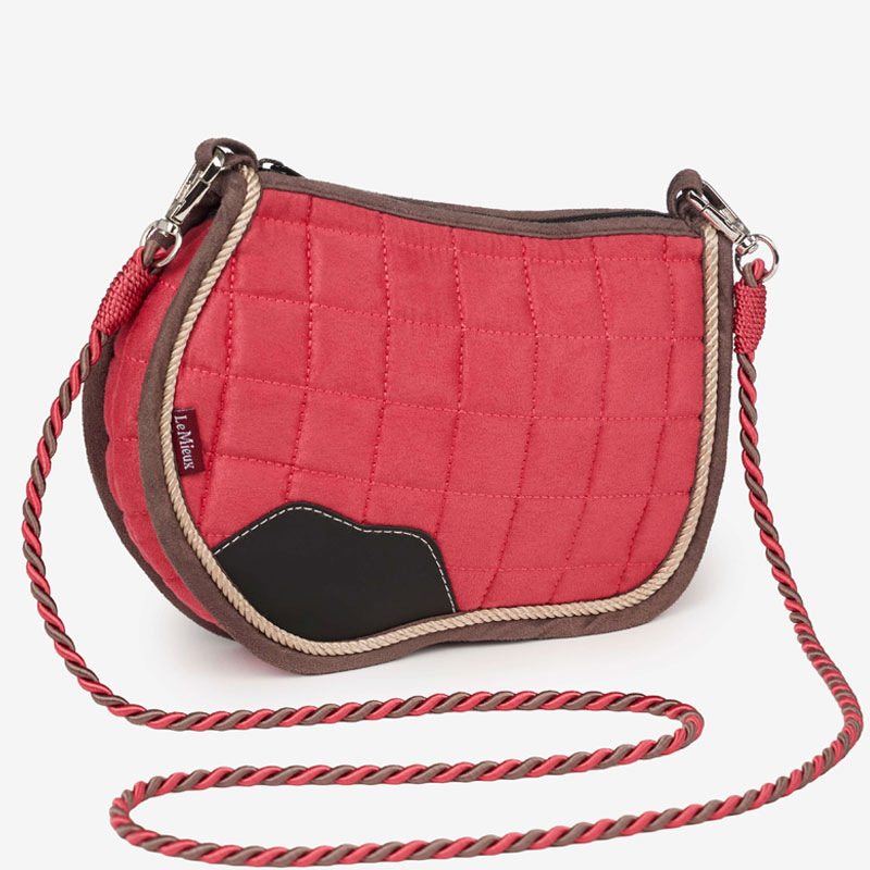 LeMieux Tas Zadeldek Raspberry. Leuk schoudertasje in het model van de welbekende LeMieux zadeldekjes. Afgewerkt in het gemakkelijk te onderhouden suede in combinatie met PU leder ter bescherming. De schouderband is ontworpen in het model van een halstertouw.