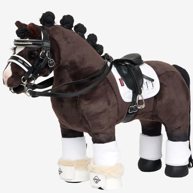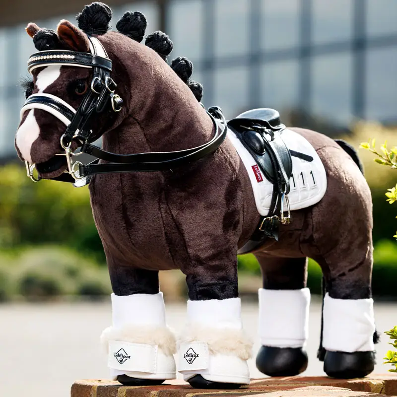 LeMieux Toy Pony Dressuur Springschoenen Wit. Te combineren met het witte dressuurdekje uit de LeMieux Toy Pony collectie. De miniatuur springschoenen zijn nauwelijks van “echte” springschoenen te onderscheiden en zijn voorzien van klittenbandsluiting en een chique imitatie bontrand aan de bovenzijde.
