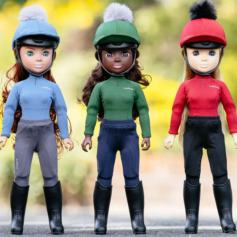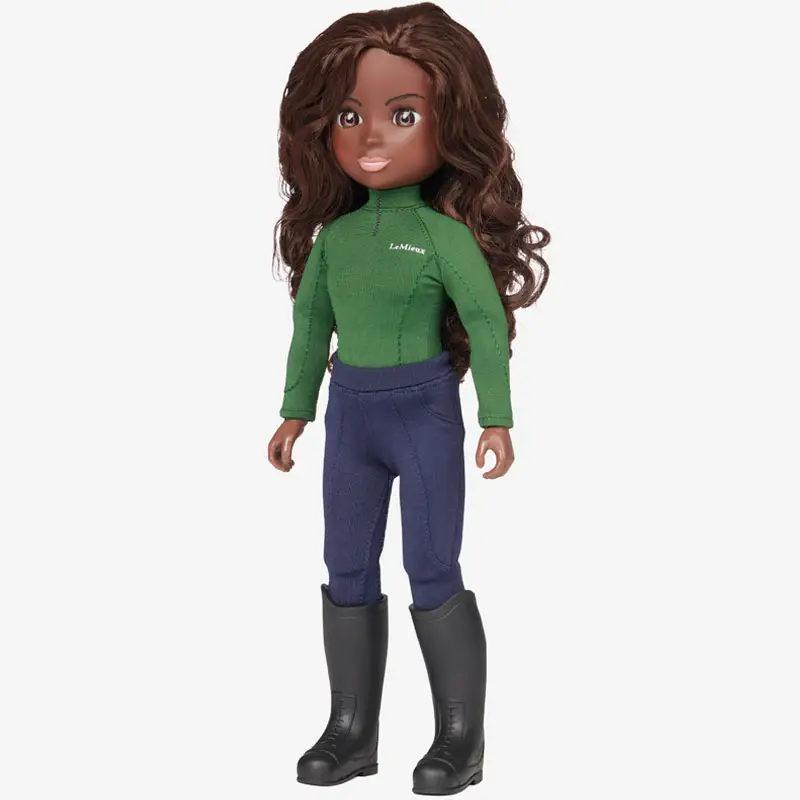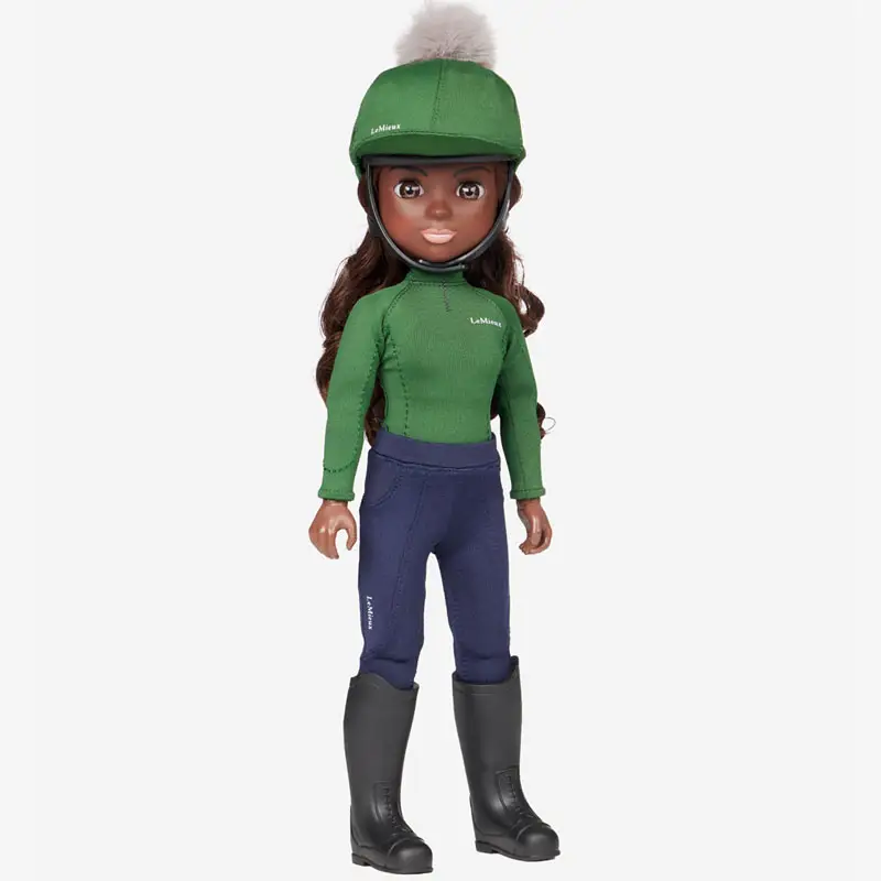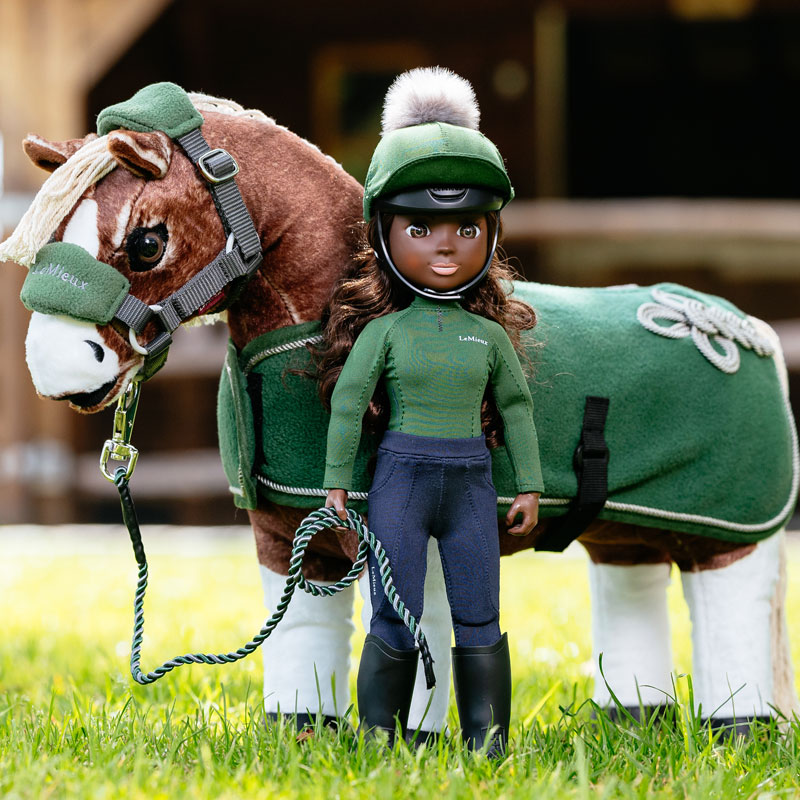 LeMieux Toy Rider Maya in het Groen gekleed is een hoogwaardige kwaliteit pop welke perfect te combineren is met de de LeMieux Toy Pony’s. De pop past perfect op de pony, zit keurig in het zadel in combinatie met de voeten in de stijgbeugels en de handen welke de teugels vasthouden. Het lange haar en de wimpers voelen echt aan. De kleding bestaat uit een cap met cap cover, shirt, broek en laarzen. De pop is zo realistisch mogelijk nagemaakt en kan zelfstandig staan.