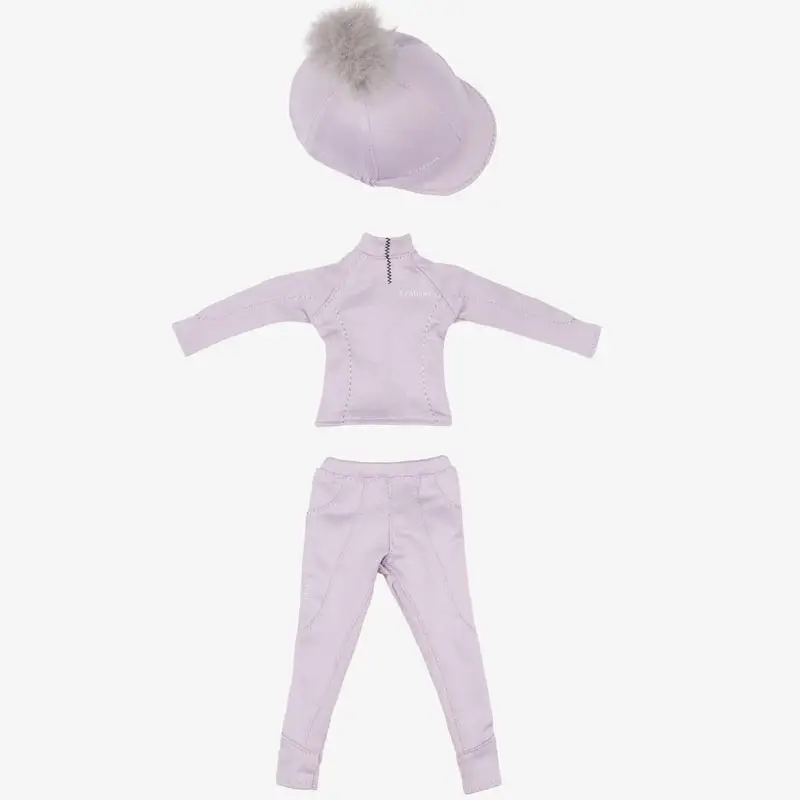 LeMieux Toy Rider Outfit Lilac. Kledingset bestaande uit een miniatuur rijbroek, basisshirt, en cap cover passend op de LeMieux Toy Riders.