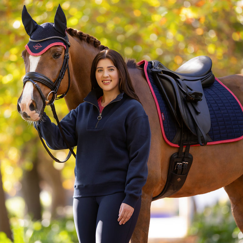 LeMieux Trui Keira Navy voor dames. Een heerlijke warme fleece gevoerde trui voorzien van een korte ritssluiting en rib details bij de kraag, aan de uiteinde van de mouwen en aan de onderzijde.